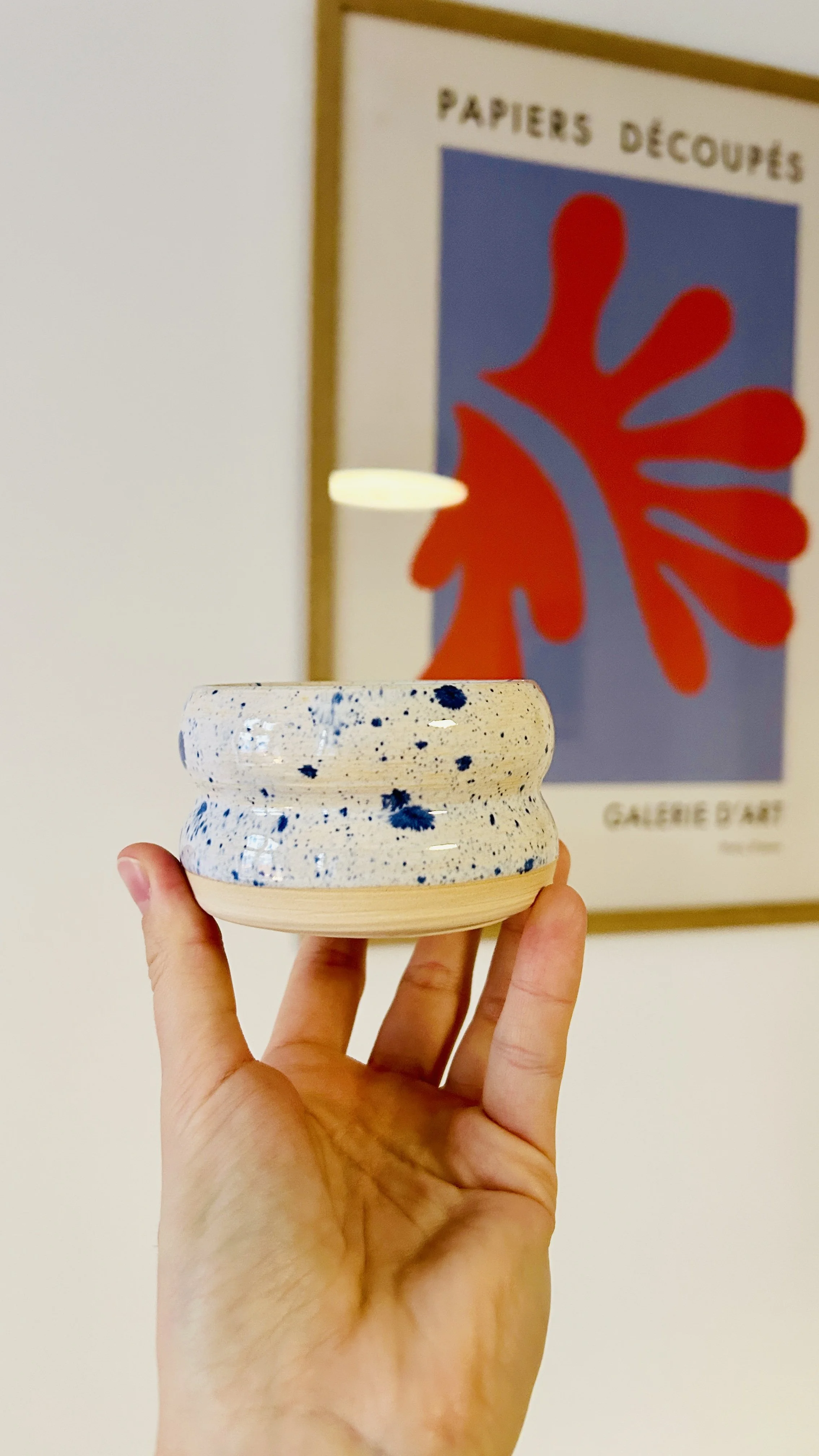 Alle meine Keramik-Werke sind handgefertigt. Diesen Bubble Cup für Kaffee, Kakao oder Tee habe ich an der Töpferscheibe gedreht und mit einer Glasur mit blauen und rosa Spots glasiert. Wenn dir das Ergebnis gefällt, freue ich mich, wenn dieser Becher es sich bald in deinem Zuhause gemütlich macht. Maße: 8 × 5,5 cm